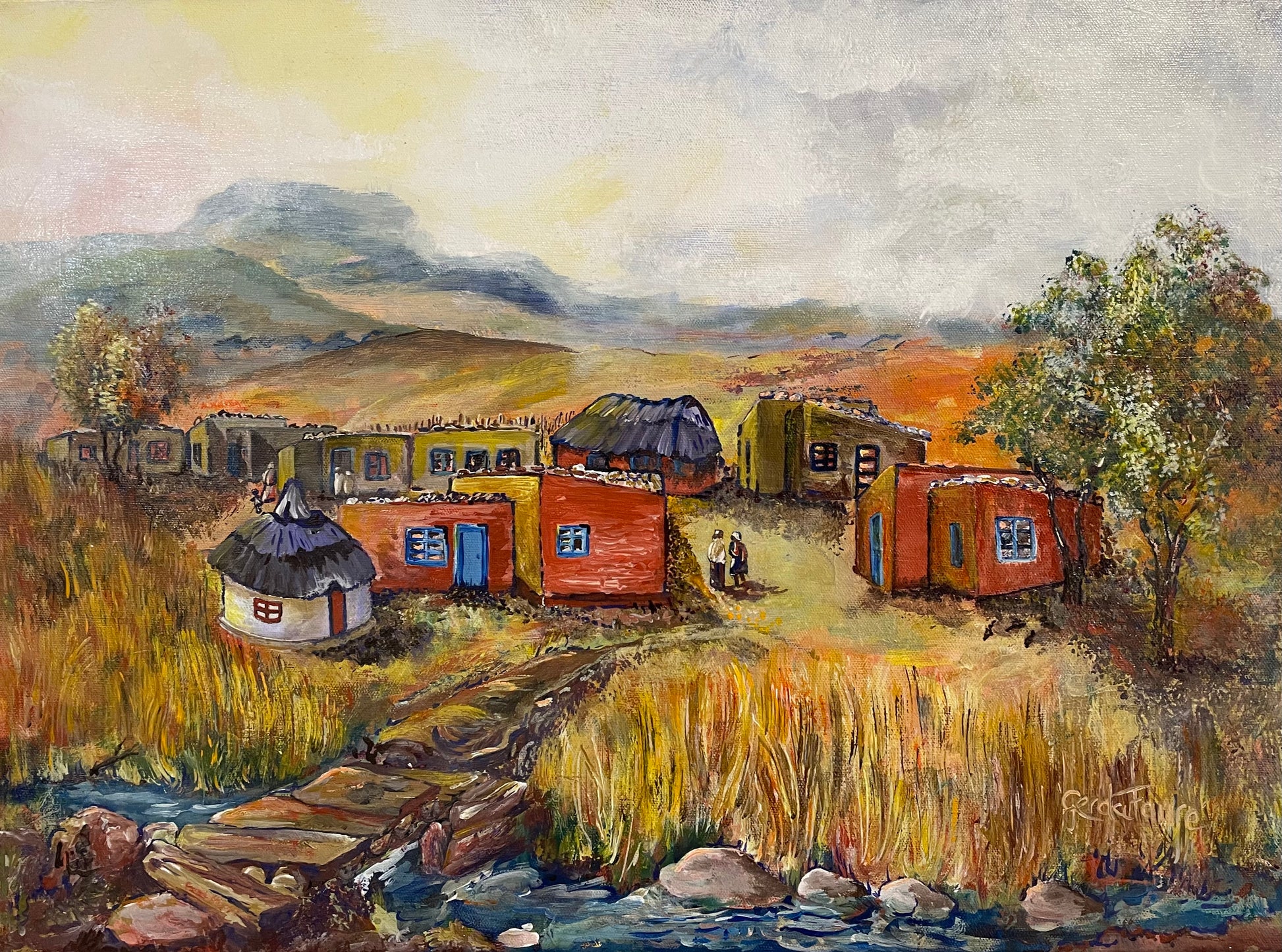 Experience the charm and beauty of the KZN Midlands with this traditional homes acrylic painting by Gerda Faure. Admire the stunning landscape and intricate details of rural settlement, all captured in a luxurious and exclusive piece of art. Perfect for any art lover or home décor enthusiast.
