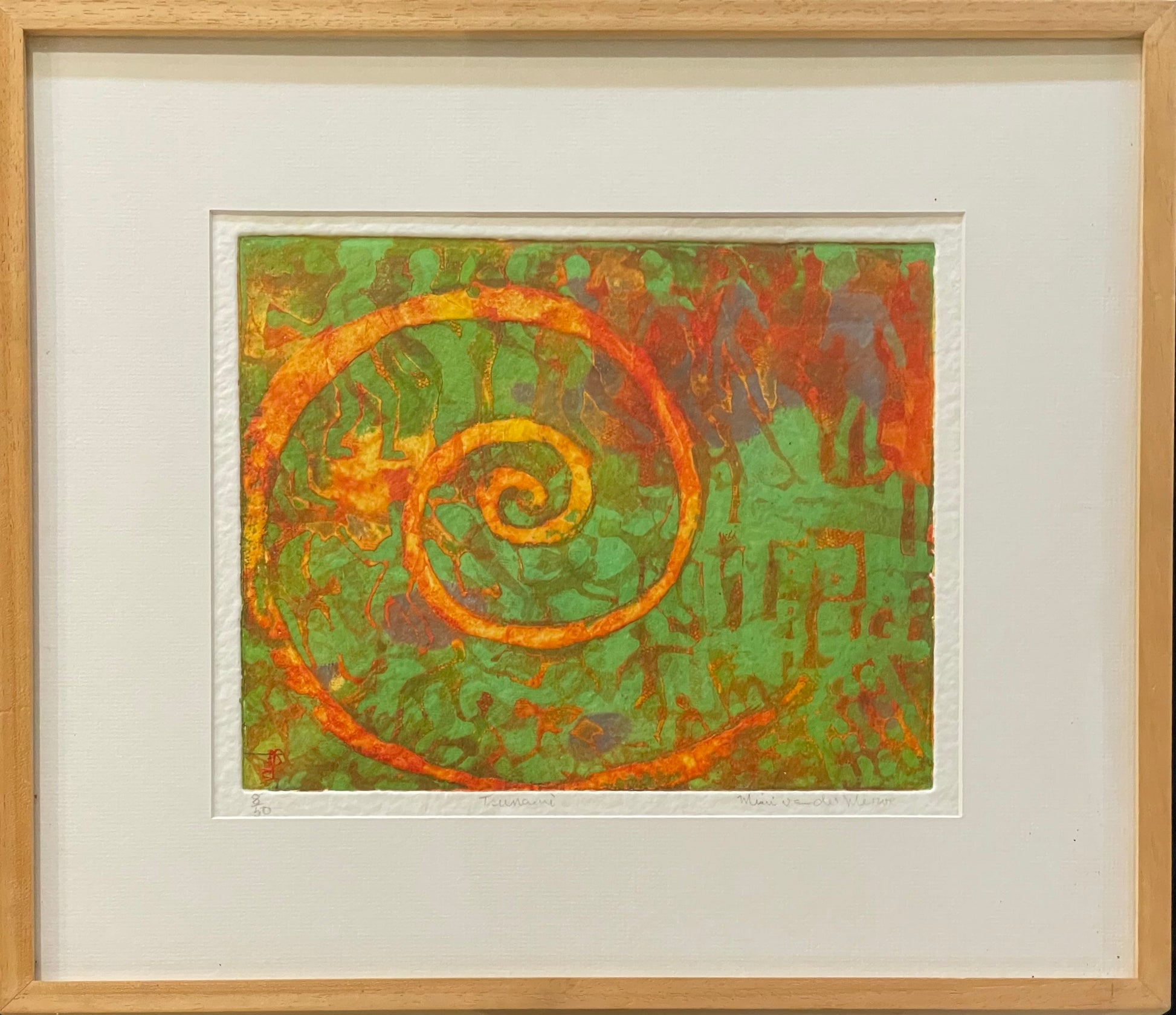 Transform your space with Tsunami, a stunning etch print using the Hayter method by Mimi van der Merwe. The intricate spiral and abstracted people collage will captivate and add a unique touch to any room. Elevate your decor and indulge in this one-of-a-kind masterpiece.