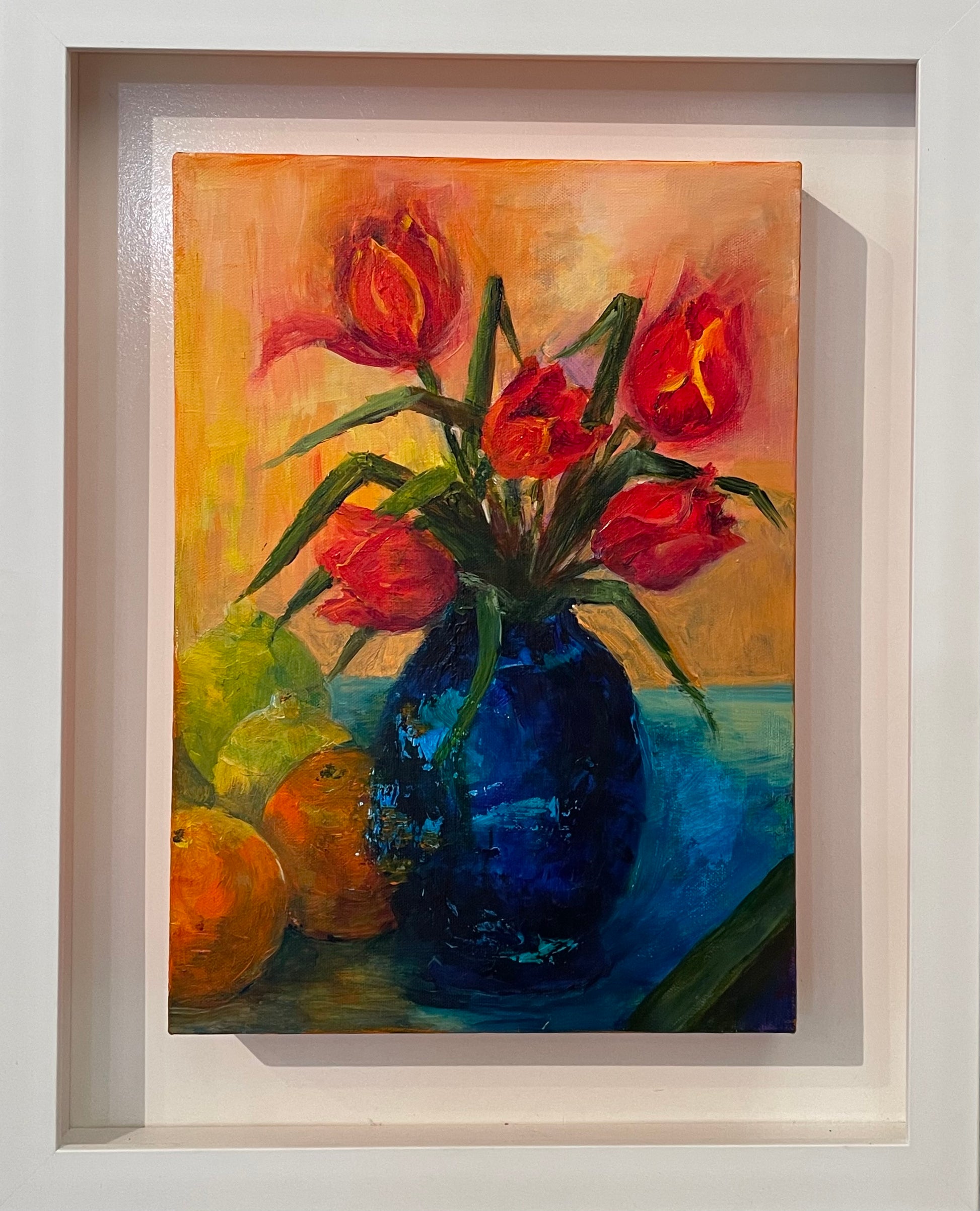 Transform any space into a luxurious oasis with this acrylic painting of red tulips in a blue vase. The vibrant colors and intricate details create a sophisticated and exclusive piece that will elevate any room. Add a touch of elegance to your home decor with these beautiful tulips in a vase.