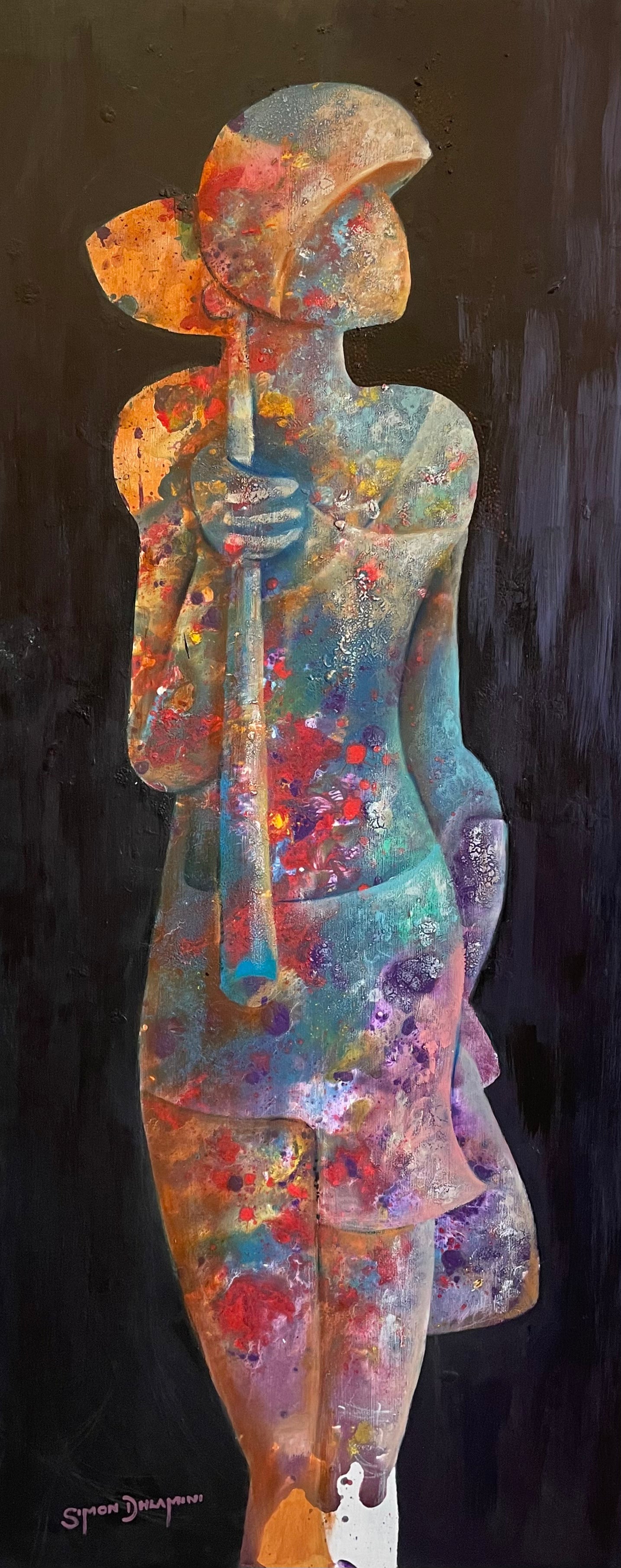 Experience the beauty of rural life with "Turn of the hoe." This stunning acrylic painting by Simon Dlamini captures the hard work and determination of a person carrying a hoe. Add a touch of rustic charm to your space and appreciate the simple joys in life.