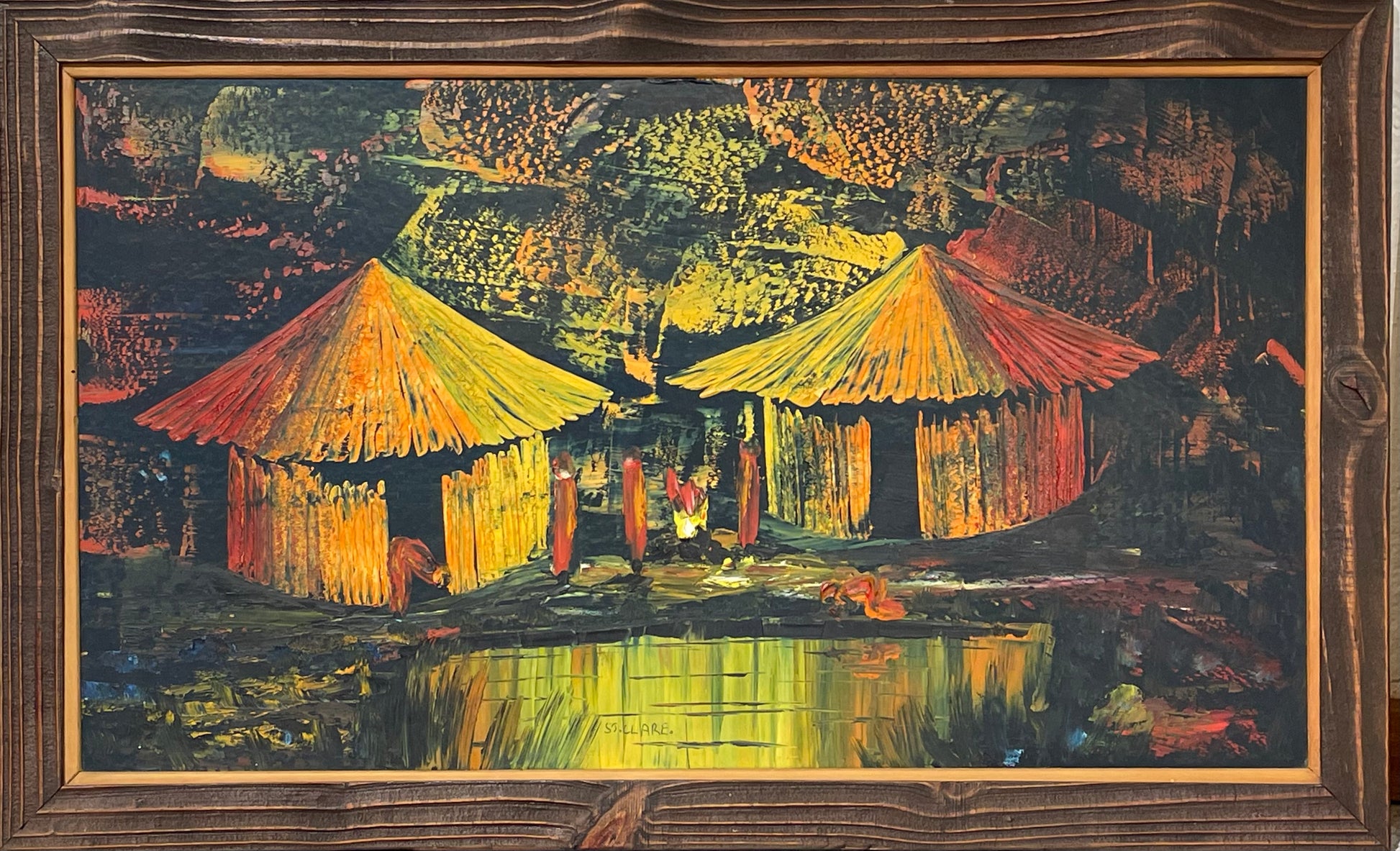 Take a journey to Africa with this oil painting by S.J. Clare, featuring two rondavels. With vibrant colors and intricate details, this piece will add a touch of culture and beauty to any space, making it the perfect addition to any art collection.