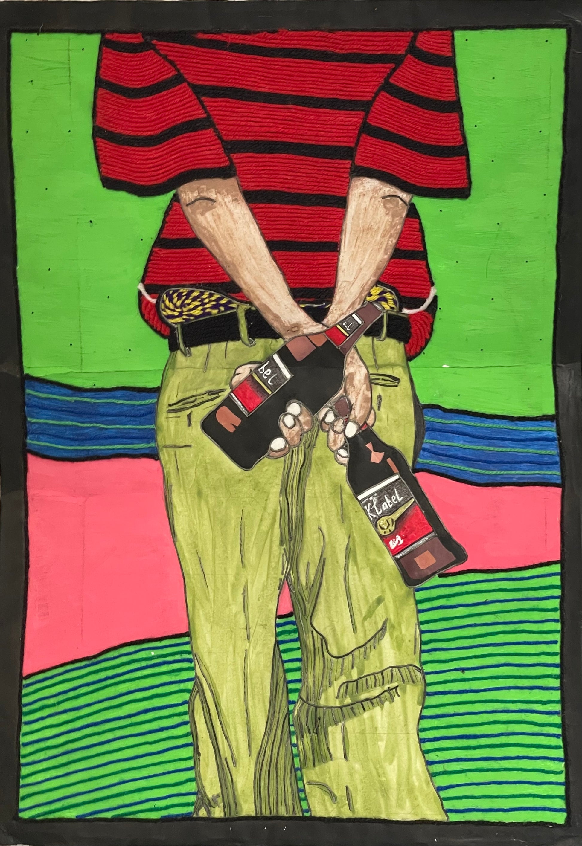 This mixed media work by artist Luvo Disane features a man hiding two courts of black label behind his back. With precise detailing and expert use of mixed media, this piece highlights the artist's mastery of the craft. A must-have for any art collector looking for a unique and thought-provoking addition to their collection.