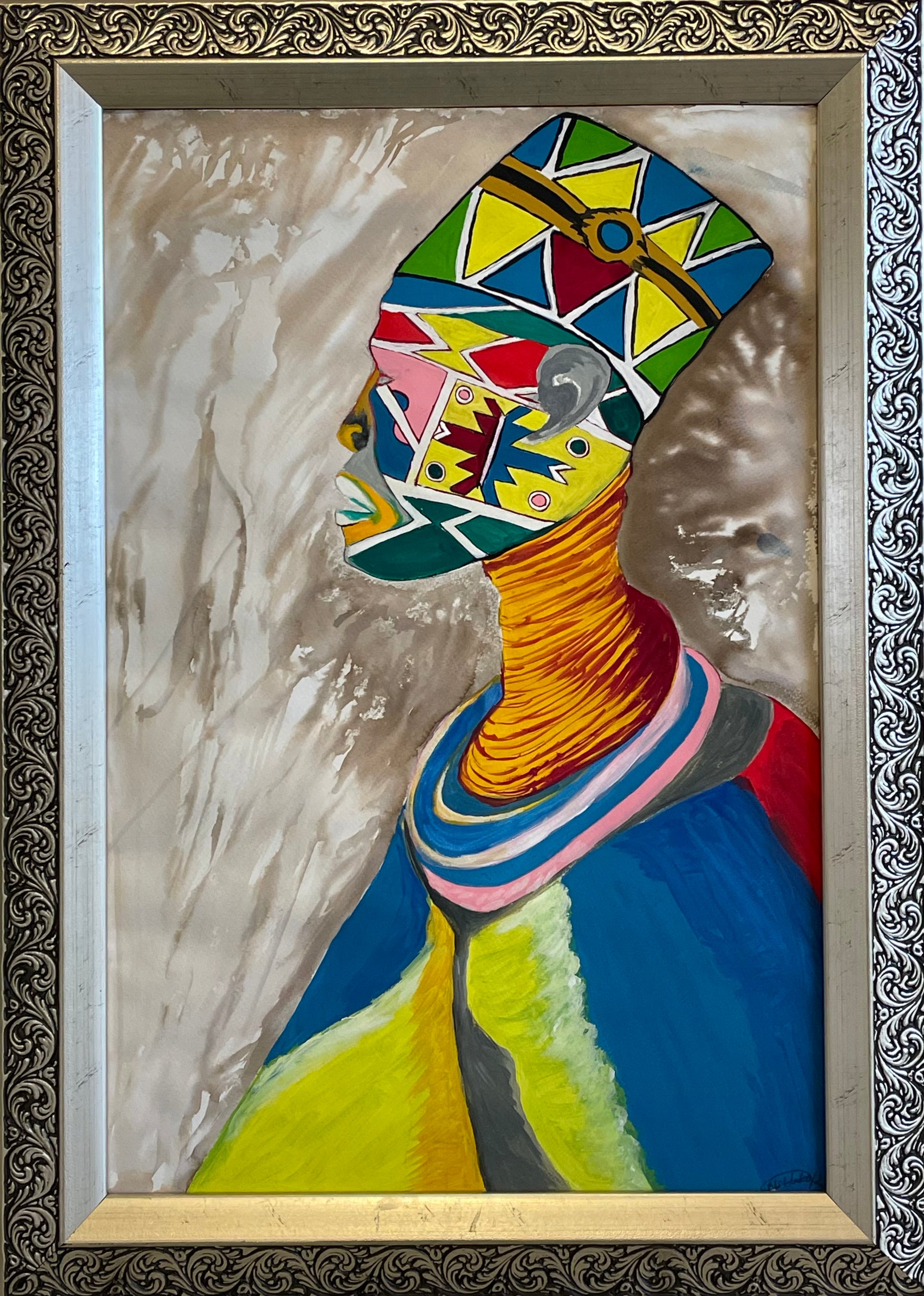 Experience the rich and vibrant culture of the Zulu people with Ugogo (Zulu: Grandma) mixed media painting by Nancy Ndaba. This stunning portrait captures the beauty and tradition of a grandmother, adorned with intricate Zulu patterns. A beautiful addition to any art collection.