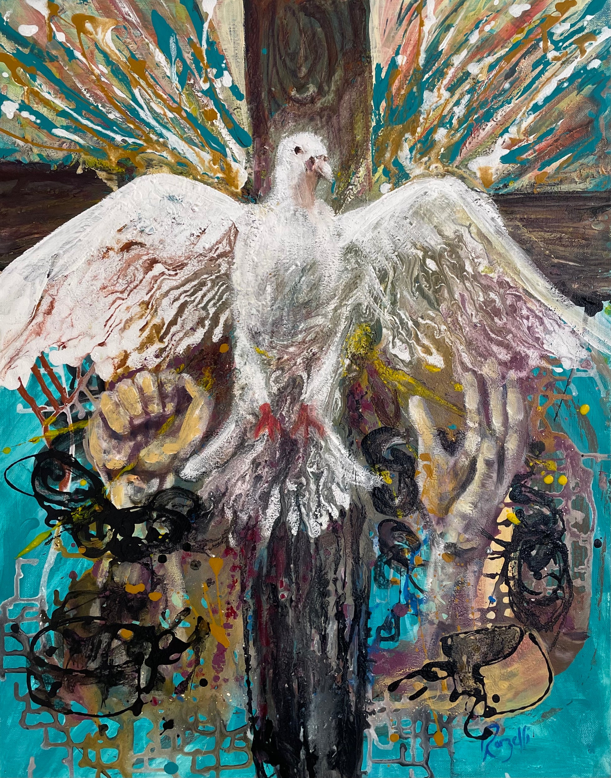 Unchained grace by Ronel Coetzee is an acrylic painting featuring a cross, white dove, bound fist, and free hand. Embodying powerful symbolism, this expertly crafted piece portrays the struggle between bondage and freedom, making it a thought-provoking addition to any art collection.