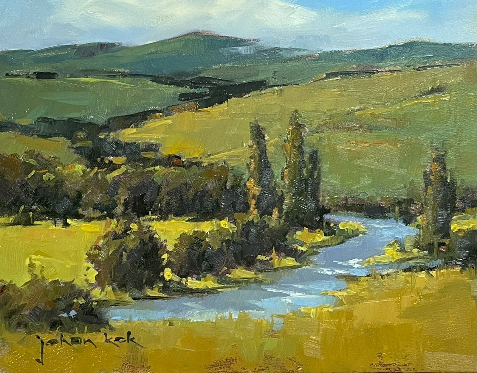 Discover the beauty of nature with Underberg Greens. This stunning oil painting captures a serene landscape from the perspective of a hill, showcasing a winding river and lush trees in the veld. Immerse yourself in the peacefulness of this picturesque scene.