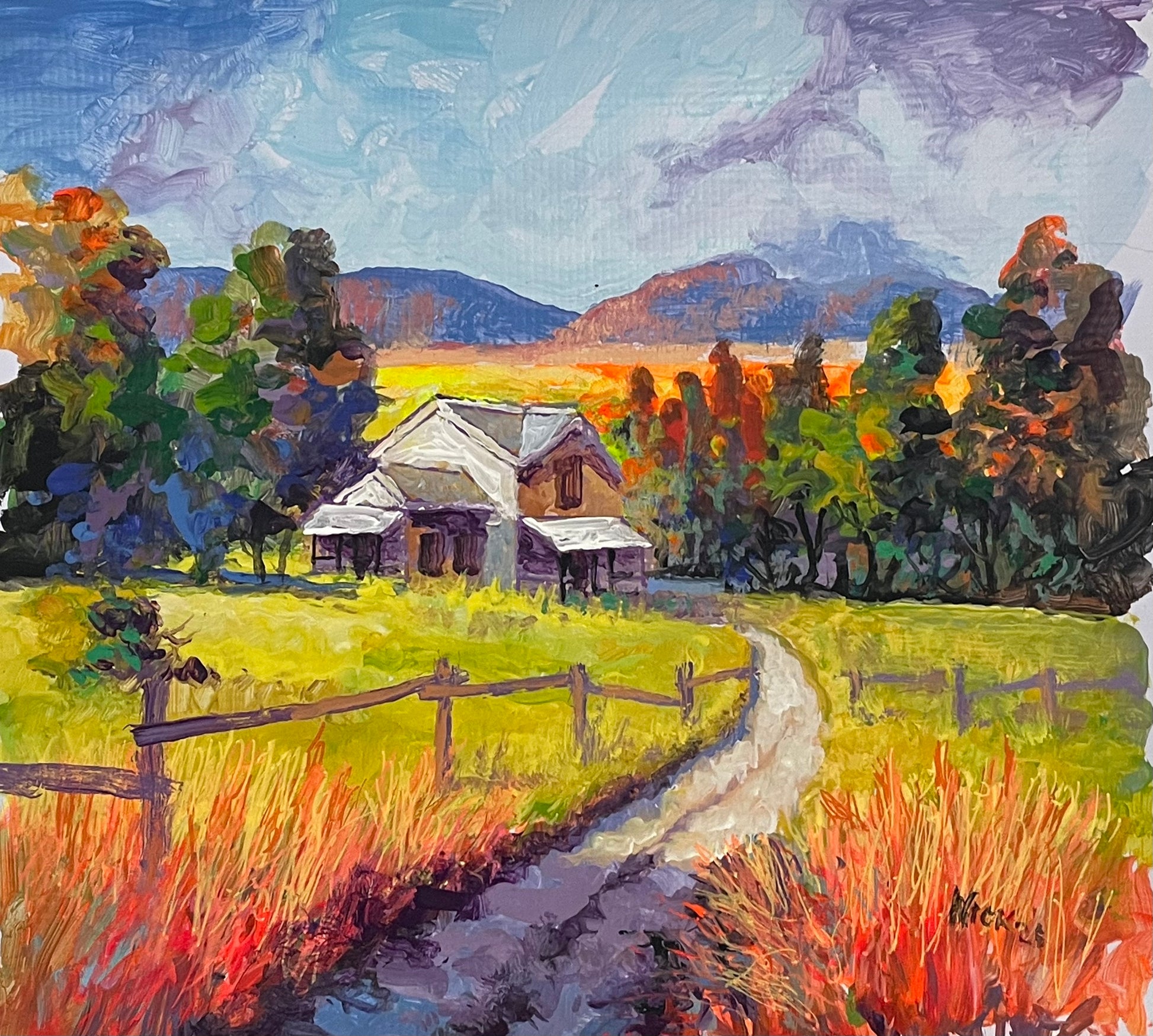 Experience the tranquil beauty of the countryside with Untitled II. This stunning acrylic painting by Nick Meyer showcases a dirt road leading up to a charming farm house against a backdrop of majestic mountains. Immerse yourself in the essence of rural living with this captivating piece.