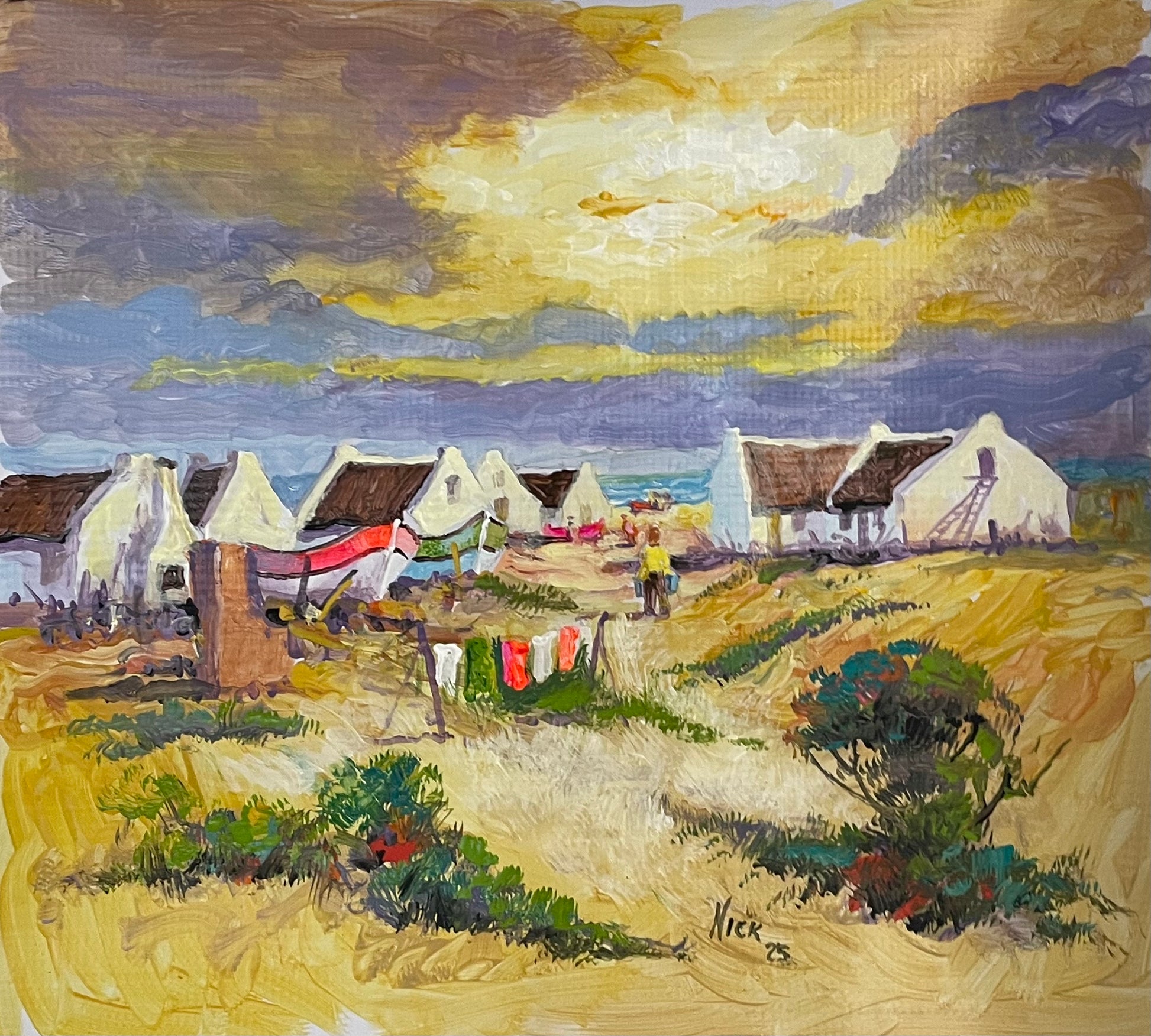 This stunning acrylic painting by Nick Meyer showcases the iconic Cape Dutch style houses, complete with a traditional washing line. Meyer's expert brushstrokes perfectly capture the unique beauty and charm of these homes, making it a must-have piece for any art lover's collection.