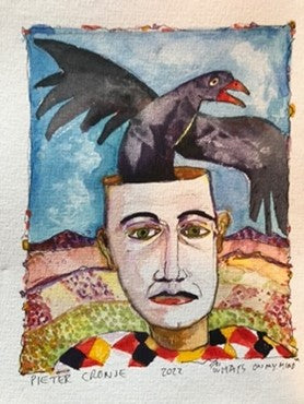 Discover the whimsical world of "What's on my mind 2022". Adorn your walls with this stunning watercolour by renowned artist Pieter Cronje featuring a jester with a crow taking flight. Let the vibrant colors and intricate details bring joy and intrigue to any space. A must-have for art lovers and collectors.