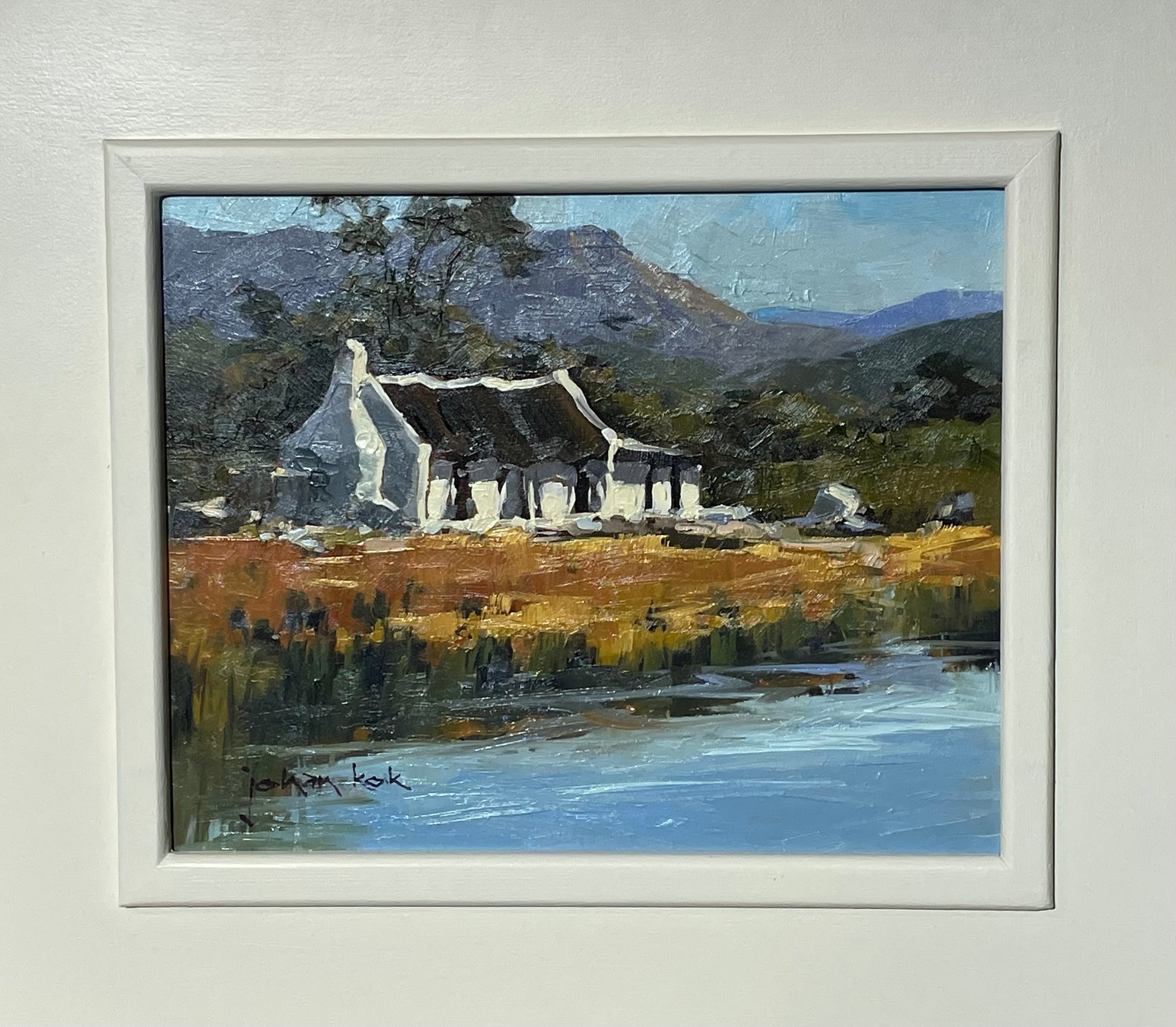 Immerse yourself in the serene beauty of this oil painting by Johan Kok. With a white washed house nestled among majestic mountains and a tranquil dam in the foreground, this piece will transport you to a world of peace and tranquility. Elevate your living space with this sophisticated and exclusive artwork.