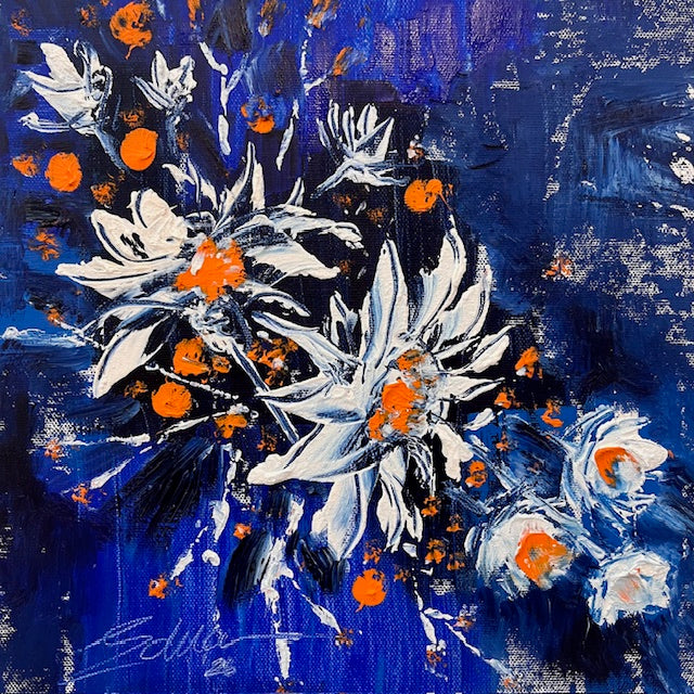 Bring a burst of nature's charm with this delightful artwork featuring crisp white blooms dancing across a serene blue canvas. This artwork adds a fresh, cheerful vibe to any room, capturing the carefree spirit of wildflowers in full bloom. This artwork is sure to brighten your walls and lift your mood. A playful celebration of nature's simple pleasures.