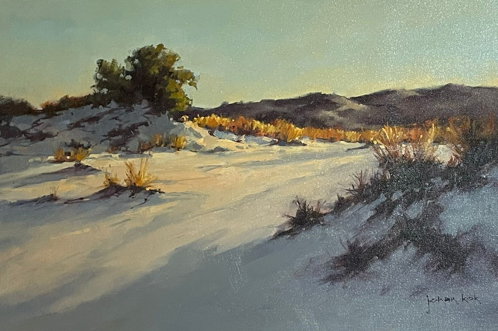 Capture the beauty of the Northern Cape with Witsand last rays by Johan Kok. This oil painting features a stunning landscape of Witsand dunes in the golden light of the setting sun. Perfect for adding a touch of nature and art to any room.