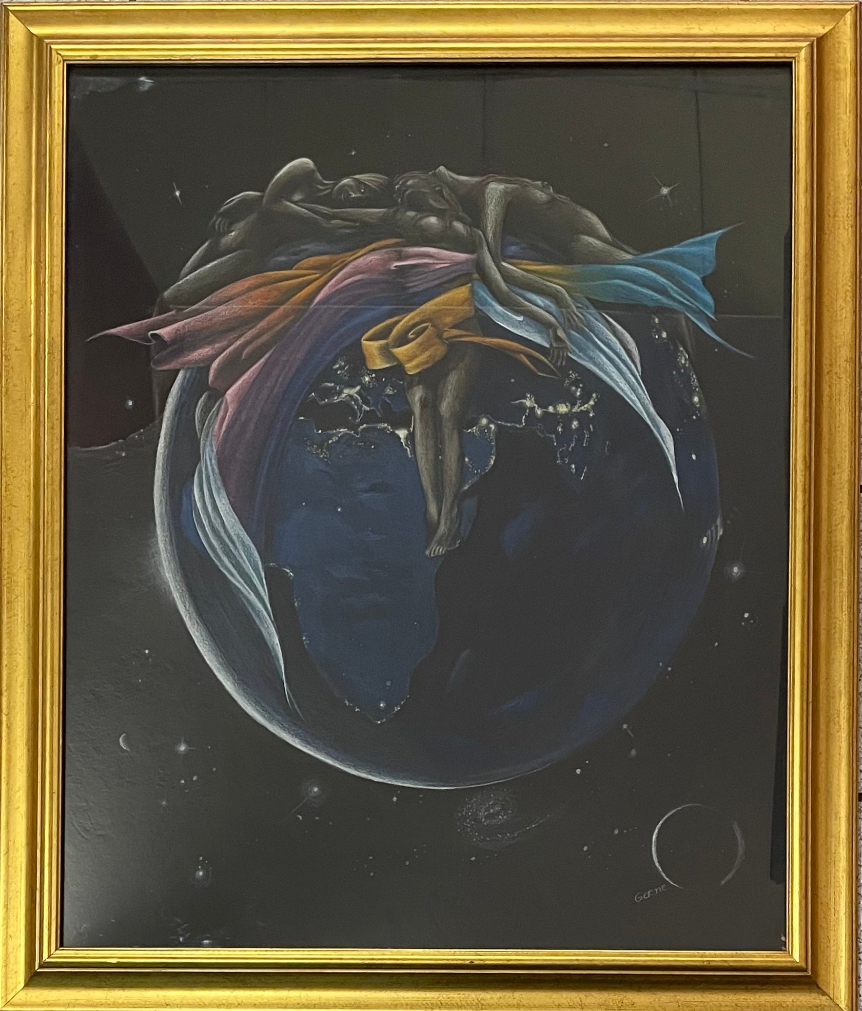 Reach new heights with "Women on top of the world"! This surrealistic color pencil drawing by Gertie Roelofze features a woman boldly lying on top of the globe. Celebrate daring and adventure with this unique piece of art.