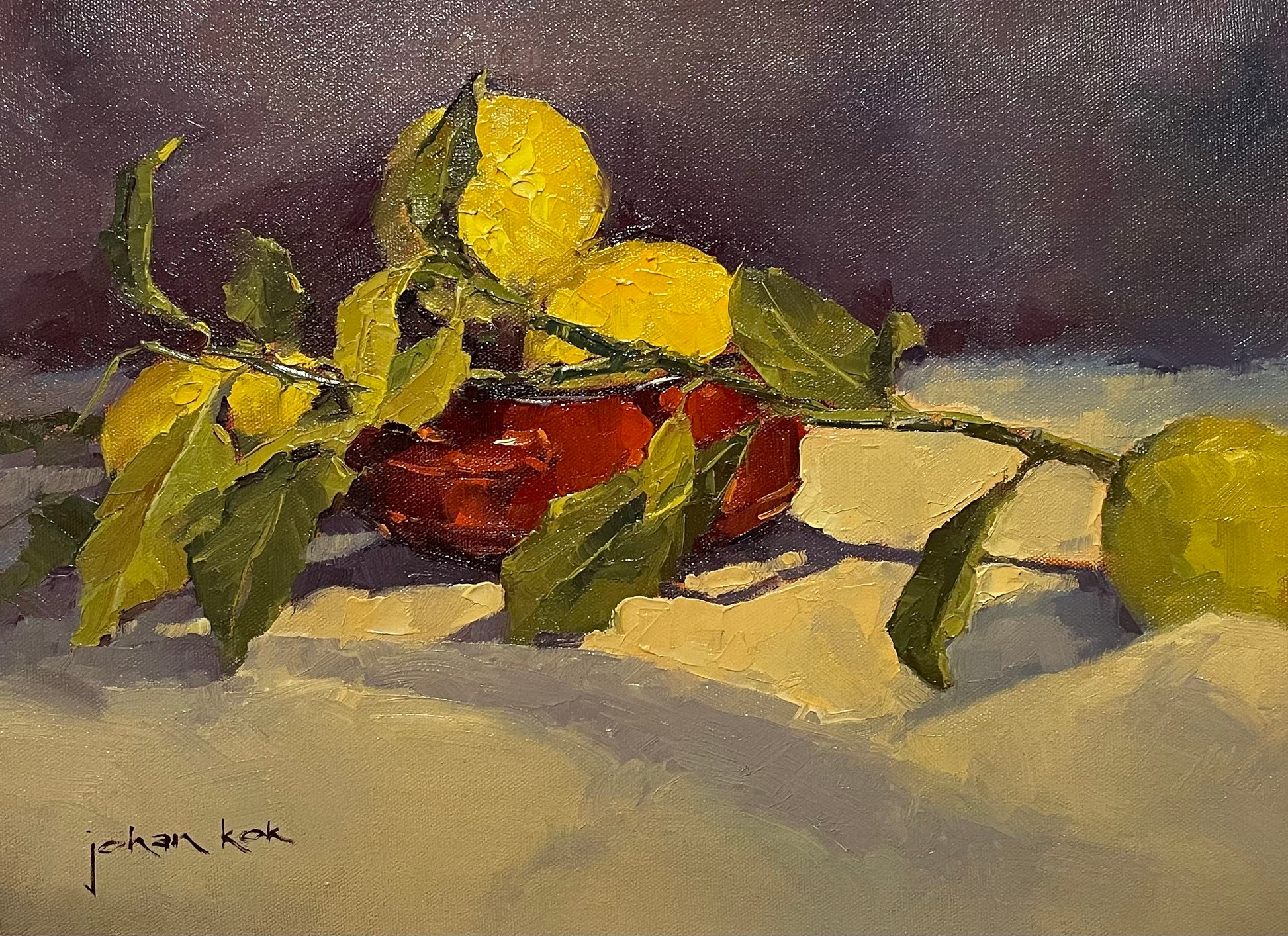 This oil painting by Johan Kok showcases a vibrant branch with delicate leaves and vibrant lemons in a striking red pot. The intricate details and bold colors make it a stunning addition to any space. Bring a touch of nature and warmth into your home with this beautiful still life piece.