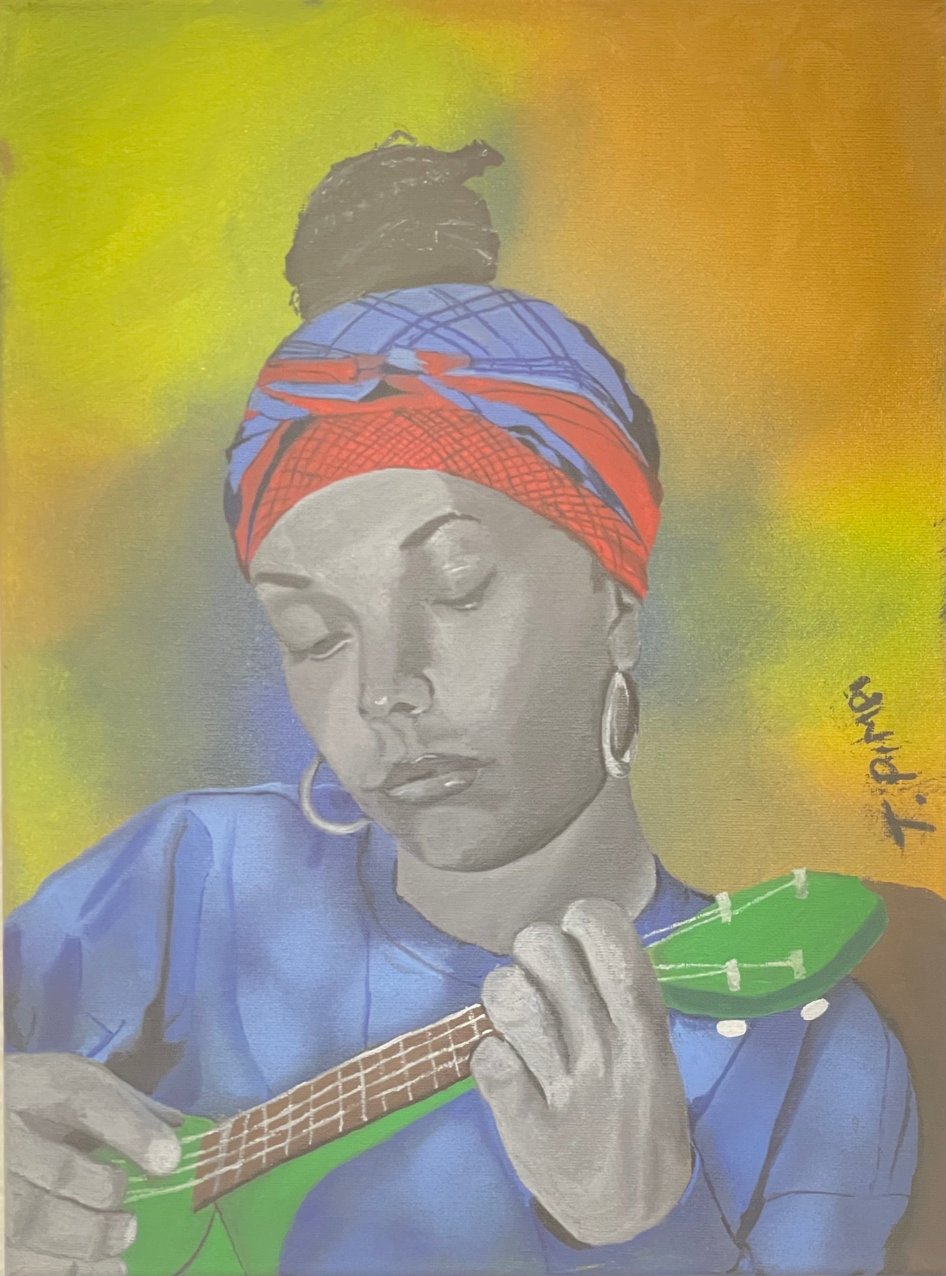 This stunning oil painting portrait by Tshegofatso Pimpi captures the joy and emotion of a woman playing music. Expertly crafted with precise brushstrokes and vibrant colors, this piece will bring your love of music to life and add a touch of elegance to any room.