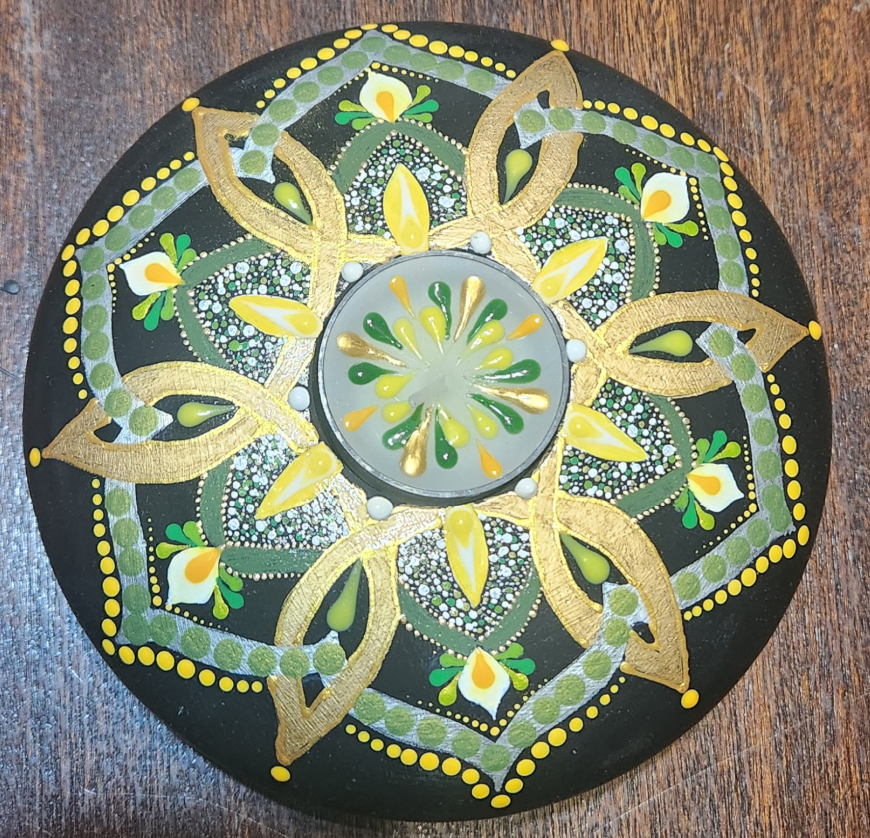 This 14cm round ornamental tealight candle holder is made of casting stone and a perfect handmade gift and functional ornament. The bright yellow and green dot art floral design will uplift any mood and makes a wonderful addition to any home.